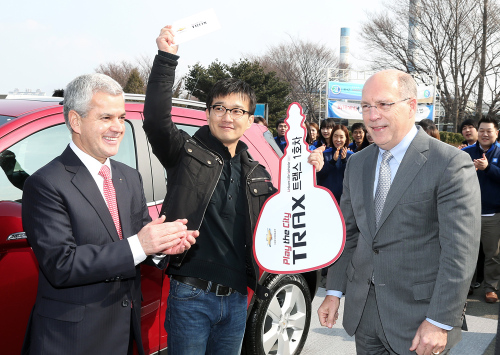 | 한국지엠은 지난 22일 트랙스 1호차 고객인 심현섭(36ㆍ가운데)씨를 한국지엠 부평 본사로 초청, GM 해외사업부문 팀 리 사장(오른쪽)과 한국지엠 세르지오 호샤(왼쪽) 사장이 모형 자동차 열쇠를 전달하는 트랙스 1호차 전달식을 가졌다.(사진 = 한국지엠 제공) |