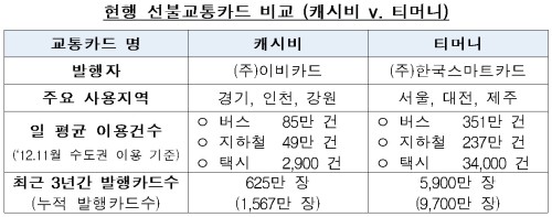 현재 수도권 지역의 버스·지하철은 2007년 11월 교통카드업체 간 호환협약에 따라 2009년부터 티머니와 캐시비 카드 모두 자유롭게 이용 가능하나, 택시는 협약 대상에 포함되지 않았다.