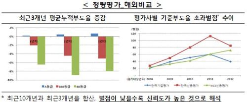 금투협은 최근 3개년 평균누적부도율을 해외신평사의 부도율과 비교해 결과를 발표해 왔다. 또 평가사별로 투자등급과 투기등급간 부도율 역전 현상에 대해서도 조사를 실시했다.