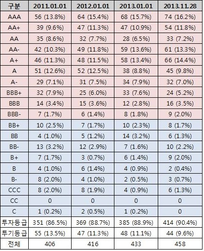 국내 회사채등급(Issuer Rating, 보험금지급능력평가 포함) 분포 <자료:KDB대우증권>