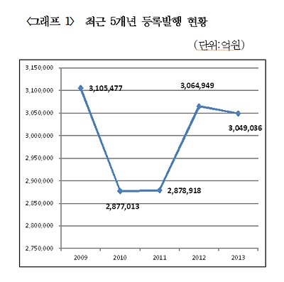 [뉴스핌=서정은 기자] 지난해 공사채 등록발행액이 전년대비 소폭 줄어든 것으로 나타났다.