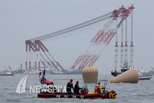 [뉴스핌=김학선 기자] 여객선 세월호 선체가 완전 침몰된 18일 전남 진도군 관매도 사고 해역에서 배가 물에 완전히 잠겨 위치를 파악하기 위해 설치한 부표 뒤로 해상크레인이 보이고 있다.