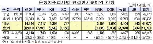 같은 기간 은행지주회사의 순이익(연결 기준, 대손준비금적립후 )은 4조1070억원으로 전년 동기 대비 8408억원(17.0%) 감소했다.