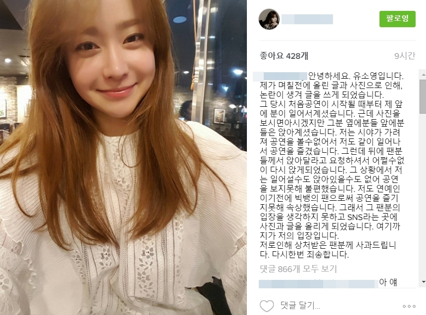 유소영은 8일 자신의 인스타그램을 통해 빅뱅 콘서트에서 앞좌석 팬의 비매너를 SNS를 통해 공개적으로 지적한 것에 대해 사과문을 게재했다.