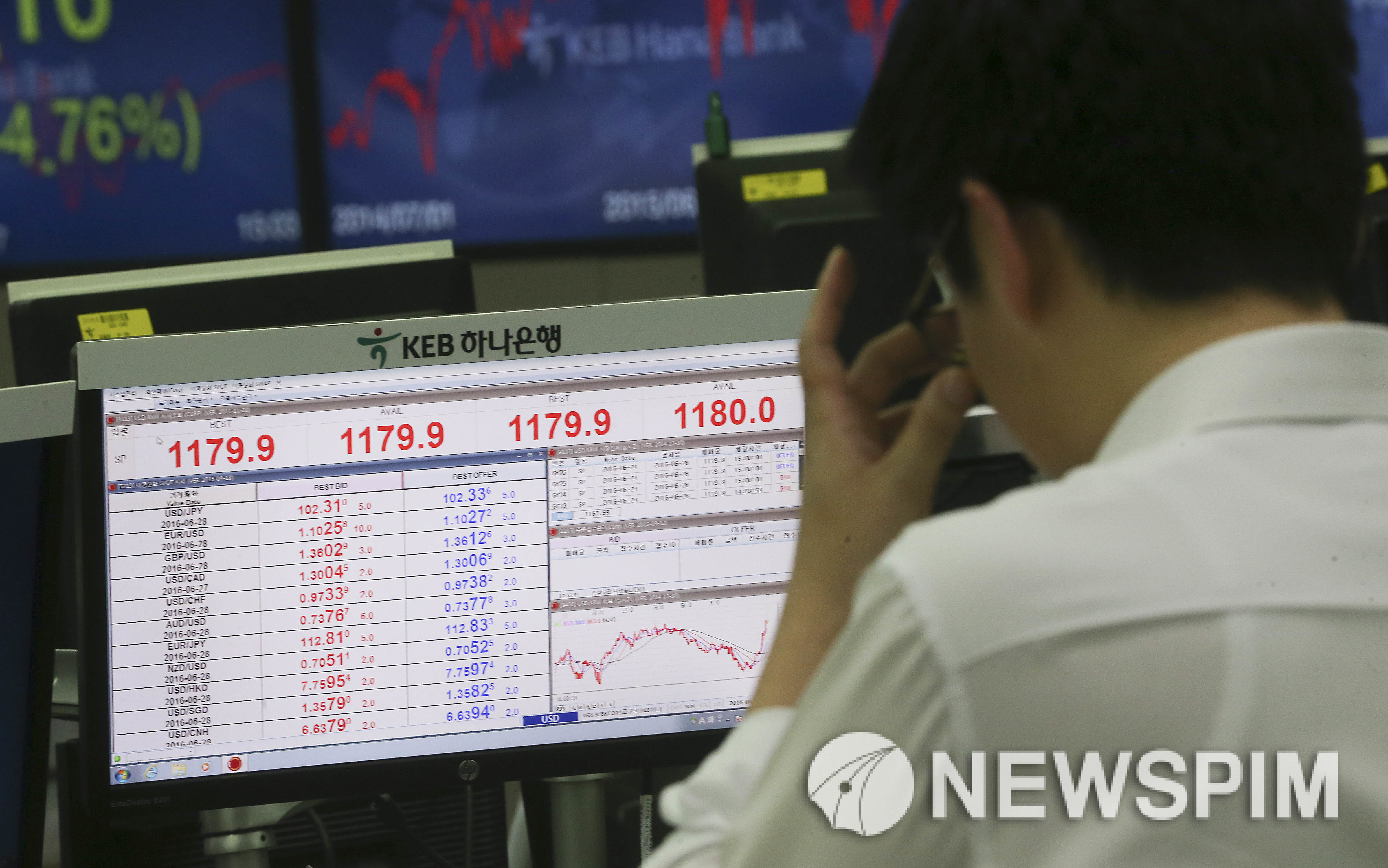[뉴스핌=이형석 기자] 24일 영국의 브렉시트 국민 투표 결과가 탈퇴 쪽으로 기울면서 원·달러 환율이 전거래일 종가보다 29.7원 오른 1179.9원에 마감했다. 이날 서울 명동 KEB하나은행 딜링룸의 외환딜러들이 분주히 업무를 보고 있다.