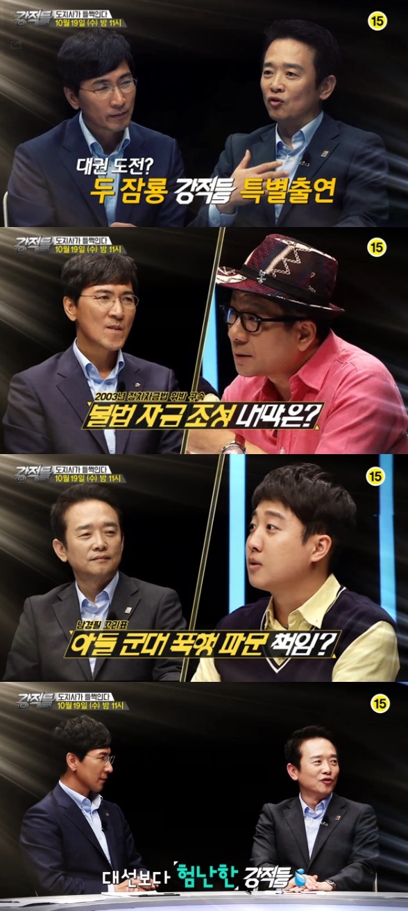 이날 '강적들' 패널들은 두 사람에 대한 끊임없는 추궁을 이어간다. 지난 2003년 안희정이 정치자금법 위반으로 구성됐을 당시, 불법 자금 조성 내막에 대해 캐묻는다.