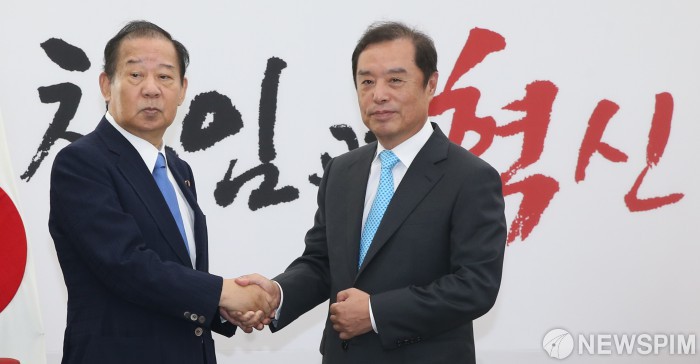[서울=뉴스핌] 최상수 기자 = 김병준 자유한국당 비상대책위원장(오른쪽)이 2일 오전 서울 여의도 국회에서 니카이 토시히로 일본 자민당 간사장을 접견하여 악수를 나누고 있다. 2018.08.02 kilroy023@newspim.com