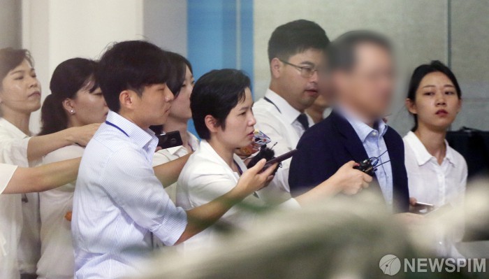 [서울=뉴스핌] 이형석 기자 = 노조와해 의혹을 받고 있는 전 삼성그룹 미래전략실 부사장 강모씨가 10일 오전 서울 서초구 서울중앙지방검찰청에 피의자 신분으로 출석하고 있다. 2018.08.10 leehs@newspim.com