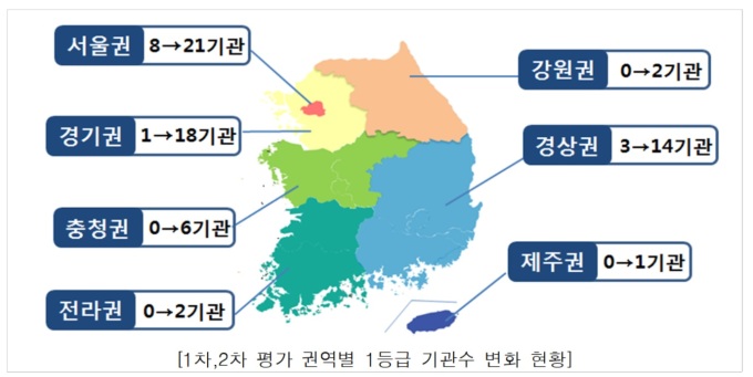 | 1차,2차 평가 권역별 1등급 기관수 변화 현황 [자료=건강보험심사평가원] |