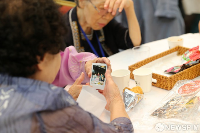 [금강산=뉴스핌] 사진공동취재단 = 제21차 남북 이산가족 2차 상봉행사 둘째 날인 25일 오후 금강산 이산가족면회소에서 남측 가족들이 북측 량차옥(82)할머니를 찍은 즉석사진을 보고 있다. 2018.08.25