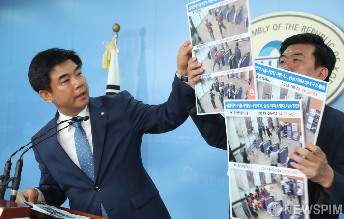 [서울=뉴스핌] 김학선 기자 = 김병욱 더불어민주당 의원이 13일 국회 정론관에서 기자회견을 열고 삼성전자 기흥사업장 이산화탄소 유출 사망사고 CCTV영상 캡처 사진을 공개하며 회사측의 대처가 매우 미숙했다고 밝히고 있다. 2018.09.13 yooksa@newspim.com