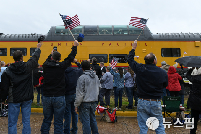 | [네바소타 로이터=뉴스핌] 정윤영 인턴기자 = 6일(현지시각) 텍사스주(州) 네바소타의 선로 변에서 시민들이 故 부시 前 대통령의 유해를 실은 '4141' 기관차를 향해 국기를 흔들며 고인의 마지막 길을 배웅하고 있다. 2018.12.06. |