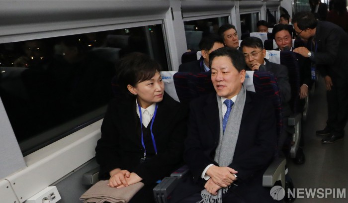 [서울=뉴스핌] 사진공동취재단 = 26일 오전 서울 용산구 서울역에서 김현미 국토교통부 장관이 남북 철도·도로 연결 및 현대화 착공식에 참석해기 위해 특별열차에 탑승해 있다. 착공식은 북측 개성 판문역에서 열린다. 2018.12.26