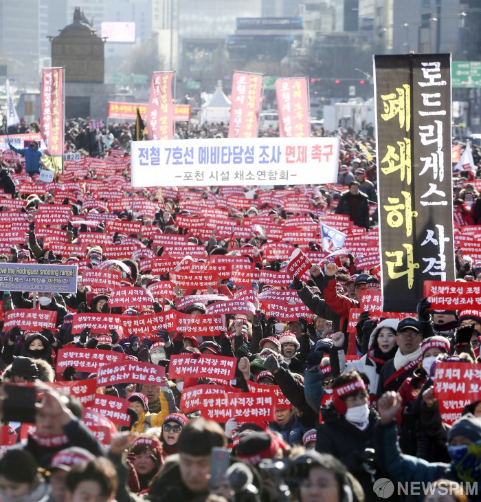 [서울=뉴스핌] 이형석 기자 = 16일 오후 서울 종로구 광화문광장에서 열린 전철7호선 예비타당성조사 면제 촉구 1만명 결의대회에서 포천 시민들이 피켓을 들고 구호를 외치고 있다. 2019.01.16 leehs@newspim.com