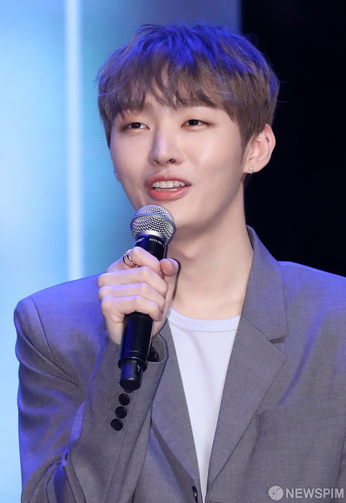 [서울=뉴스핌] 정일구 기자 = 워너원 출신 가수 윤지성이 20일 오후 서울 용산구 블루스퀘어에서 열린 첫 솔로 데뷔 앨범 'Aside' 쇼케이스에서 인사말을 하고 있다. 타이틀곡 'In the Rain(인 더 레인)'은 사랑하는 이와의 준비 없는 이별을 맞은 한 남자의 진솔한 감정을 담은 팝 알앤비 장르의 곡이다. 2019.02.20 mironj19@newspim.com