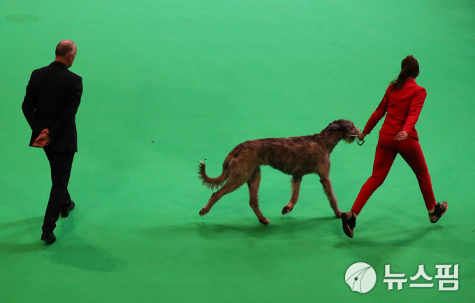 [버밍엄 로이터=뉴스핌] 남혜경 인턴기자 = 9일(현지시간) 영국 버밍엄에서 열린 세계 최대 연례 명견 경연대회 '크러프츠 도그쇼'(Crufts Dog Show) 셋째 날에 아이리시 울프 하운드 한 마리가 심사를 받고 있다. 2019.03.09.