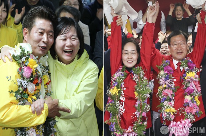 [창원.통영=뉴스핌] 최상수,이한결기자 = 4·3 국회의원 보궐선거 창원 성산에 출마한 여영국 정의당 후보와 이정미 대표가 경상남도 창원시 의창구에 마련된 선거사무실에서 당선이 확실시 되자 포옹을 하고 있다.(왼쪽), 통영 고성 출마한 정점식 자유한국당 후보와 지지자들이 통영시 북신동 선거사무소에서 당선이 확실시 되자 만세를 외치고 있다. 2019.04.03 2019.04.03 kilroy023@newspim.com