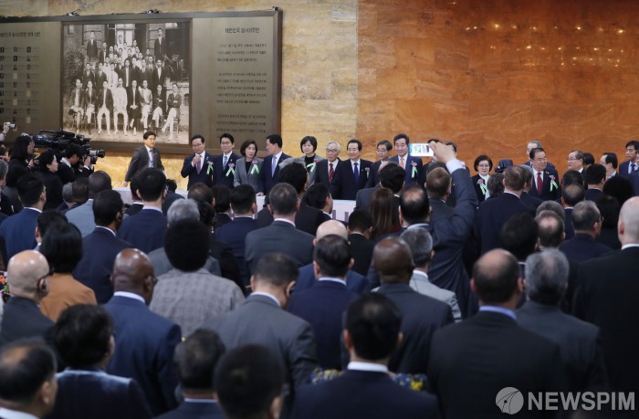 [서울=뉴스핌] 김학선 기자 = 10일 서울 여의도 국회 로텐더홀에서 열린 임시의정원 100주년 기념식 행사에서 문희상 국회의장, 이낙연 국무총리, 유남석 헌법재판소장, 김명수 대법원장, 임시의정원 요인 후손 등 내외귀빈들이 임시의정원 기념작품 제막식을 하고 있다. 2019.04.10 yooksa@newspim.com