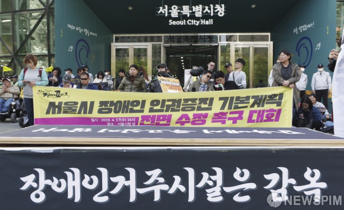 [서울=뉴스핌] 백인혁 인턴기자 = 17일 오후 서울 중구 서울시청 앞에서 열린 제 2기 서울시 장애인 인권증진 기본계획 수정 촉구 결의대회에서 참석자들이 10년 내 모든 중증장애인 탈시설 계획 수립을 촉구하는 집회를 열고 있다. 2019.04.17 dlsgur9757@newspim.com