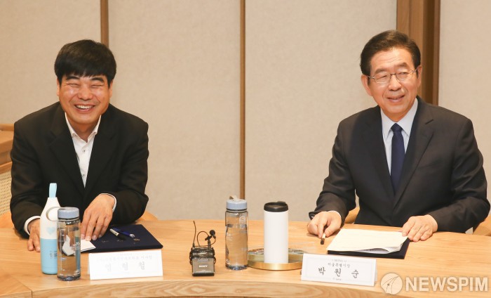 [서울=뉴스핌] 이한결 인턴기자 = 염형철 수돗물시민네트워크 이사장(왼쪽)과 박원순 서울시장이 22일 오전 서울 중구 시청에서 열린 ‘서울시-시민단체 수돗물 사랑 협약식’에 참석하여 대화를 나누고 있다. 2019.04.22