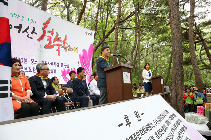 | 허성곤 김해시장이 19일 신어장 정상 철쭉 군락지에서 열린 제16회 신어산 철쭉축제 행사에서 축사하고 있다.[사진=김해시청 제공]2019.5.19. |