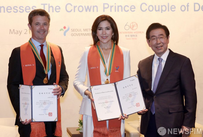 [서울=뉴스핌] 정일구 기자 = 박원순 서울시장이 21일 오후 서울 중구 신라호텔에서 한국-덴마크 수교 60주년을 기념해 방한한 덴마크의 프레데릭 왕세자와 메리 왕세자비에게 서울시 명예시민증을 수여한 뒤 기념촬영을 하고 있다. 2019.05.21 mironj19@newspim.com