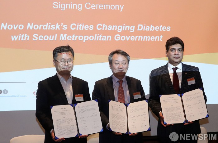 [서울=뉴스핌] 정일구 기자 = 21일 오후 서울 중구 신라호텔에서 열린 한국-덴마크 헬스케어 세미나에서 양국 보건 관계자들이 당뇨병 줄이기 프로젝트 협약서에 사인한 뒤 기념촬영을 하고 있다. 2019.05.21 mironj19@newspim.com
