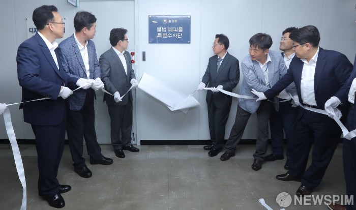 [과천=뉴스핌] 윤창빈 기자 = 조명래 환경부 장관(왼쪽 세번째)과 참석자들이 4일 오후 경기 과천시 정부과천청사에서 열린 환경부 불법 폐기물 특별수사단 출범식에서 현판식을 하고 있다. 2019.06.04 pangbin@newspim.com