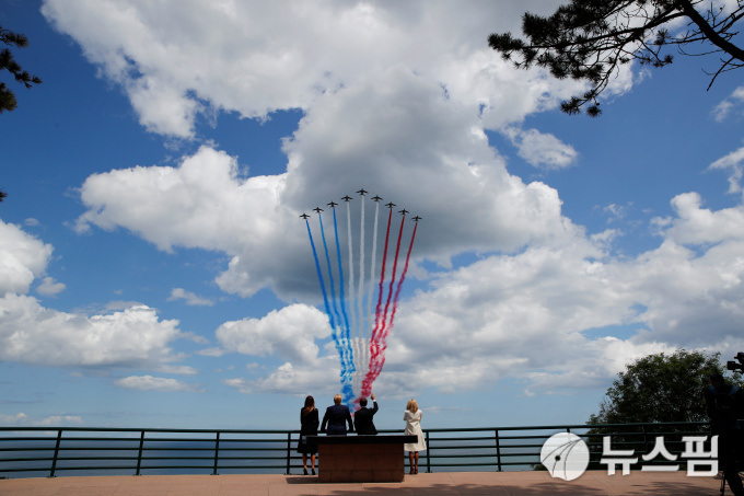 [노르망디 로이터=뉴스핌] 황숙혜 기자 = 노르망디 상륙작전 75주년 공군 퍼포먼스를 보는 도널드 트럼프 미국 대통령 부부와 엠마뉘엘 마크롱 프랑스 대통령 부부. 2019. 06. 06.