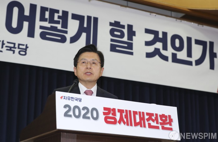 [서울=뉴스핌] 이형석 기자 = 황교안 자유한국당 대표가 18일 오전 서울 여의도 국회 의원회관에서 열린 2020 경제대전환위원회 제1차 전체 토론회에서 축사를 하고 있다. 2019.06.18 leehs@newspim.com