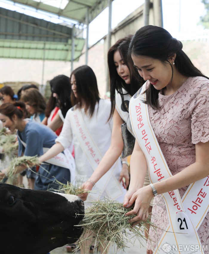 [보령=뉴스핌] 최상수 기자 = 24일 오후 충남 보령시 우유창고에서 2019 미시즈 유니버스코리아 참가자들이 목장 견학을 하고 있다. 2019.06.24 kilroy023@newspim.com