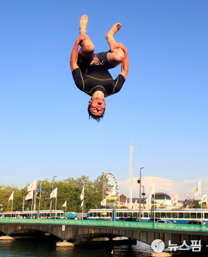 | [취리히 로이터=뉴스핌] 박우진 기자 = 4일(현지시간) 스위스 취리히에서 열린 취리히 페스티벌을 앞두고 한 남성이 취리히 리마트 강으로 공중에서 덤블링을 하며 뛰어들고 있다. 2019.07.04 |