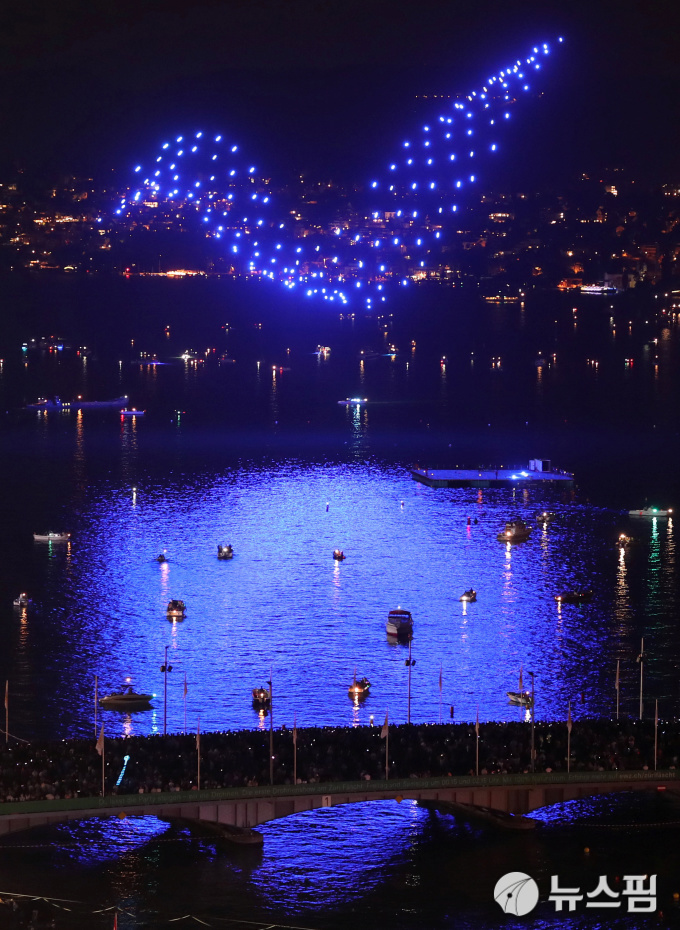 | [취리히 로이터=뉴스핌] 박우진 기자 = 6일(현지시간) 스위스 취리히에서 열린 취리히 페스티벌에서 수십대의 드론이 밤하늘에 새 모양을 만들어내는 퍼포먼스를 선보이고 있다. 2019.07.06 |