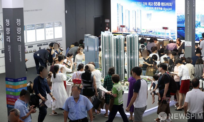 [서울=뉴스핌] 정일구 기자 = 19일 오후 서울 성동구 청량리역 롯데캐슬 SKY-L65 모델하우스에서 방문객들이 견본주택 모형을 살펴보고 있다. 청량리역 롯데캐슬 SKY-L65는 청량리 4구역을 재개발하는 대규모 복합단지로 지하 7층~지상 최고 65층 5개 동에 아파트 1425가구, 오피스텔, 오피스, 호텔 등이 조성된다. 2019.07.19 mironj19@newspim.com