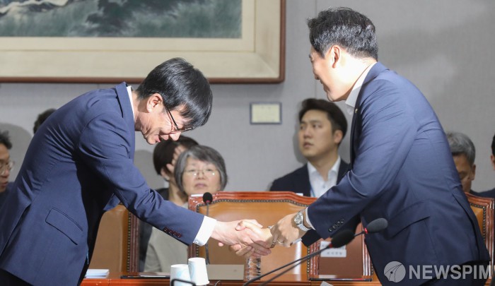 [서울=뉴스핌] 최상수 기자 = 김상조 청와대 정책실장, 손금주 무소속 의원이 6일 오전 서울 여의도 국회에서 열린 운영위원회 전체회의에서 악수를 나누고 있다. 2019.08.06 kilroy023@newspim.com