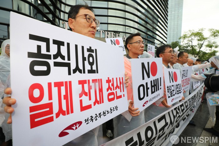 [서울=뉴스핌] 백인혁 기자 = 전국공무원노동조합 회원들이 7일 오전 서울 종로구 일본대사관 앞에서 아베정권 규탄·한일군사정보 보호협정 폐기 촉구 기자회견을 하고 있다. 2019.08.07 dlsgur9757@newspim.com
