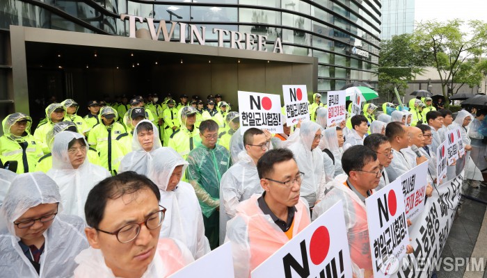 [서울=뉴스핌] 백인혁 기자 = 전국공무원노동조합 회원들이 7일 오전 서울 종로구 일본대사관 앞에서 아베정권 규탄·한일군사정보 보호협정 폐기 촉구 기자회견을 하고 있다. 2019.08.07 dlsgur9757@newspim.com