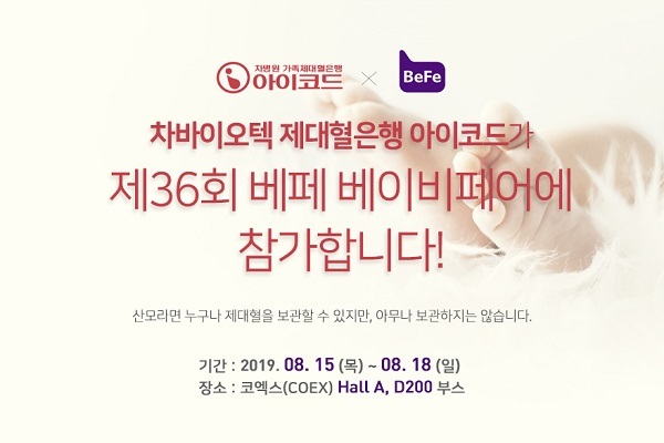 | 차바이오텍은 제대혈은행 ‘아이코드’가 오는 15일부터 18일까지 4일간 서울 삼성동 코엑스에서 열리는 제36회 베페 베이비페어에 참가한다고 9일 밝혔다. [이미지=차바이오텍] |