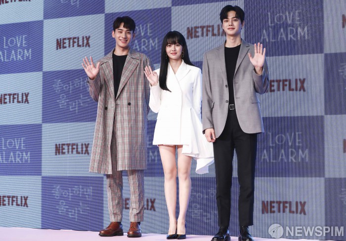 [서울=뉴스핌] 이한결 기자 = 왼쪽부터 배우 정가람, 김소현, 송강이 20일 오전 서울 종로구 JW 메리어트 동대문 스퀘어 서울에서 열린 넷플릭스 오리지널 시리즈 ‘좋아하면 울리는’ 제작발표회에서 포즈를 취하고 있다. 인기 웹툰을 원작으로 한 ‘좋아하면 울리는’은 오는 22일 넷플릭스를 통해 공개된다. 2019.08.20 alwaysame@newspim.com