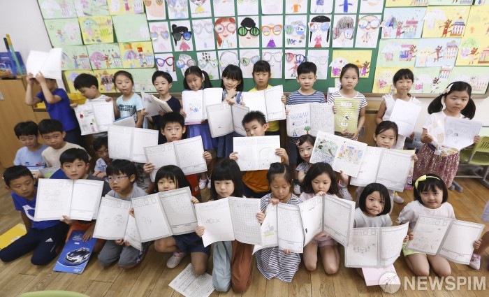 [서울=뉴스핌] 이한결 기자 = 초등학교 개학일인 21일 오전 서울 여의도 윤중초등학교에서 초등학생들이 방학숙제를 들어보이고 있다. 2019.08.21 alwaysame@newspim.com