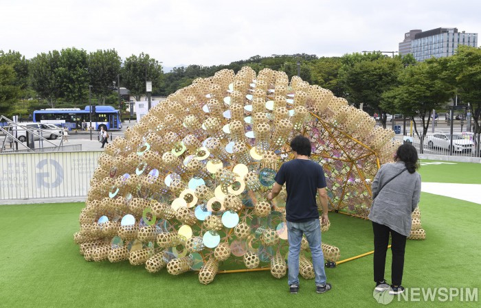 [서울=뉴스핌] 이한결 기자 = 5일 오전 서울 종로구 세운상가에서 열린 ‘2019 서울도시건축비엔날레’ 사전 투어에서 시민들이 전시된 작품들을 감상하고 있다. 서울도시건축비엔날레는 DDP, 돈의문박물관마을, 도시건축전시관, 세운상가에서 오는 7일부터 11월 10일까지 진행된다. 2019.09.05 alwaysame@newspim.com
