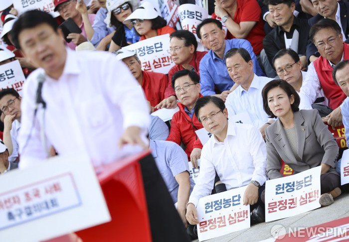 [서울=뉴스핌] 이한결 기자 = 황교안 자유한국당 대표와 나경원 원내대표가 15일 오후 서울 여의도 국회의사당 앞 계단에서 열린 ‘위선자 조국 사퇴 촉구결의대회’에서 정용기 정책위의장의 발언을 듣고 있다. 2019.09.15 alwaysame@newspim.com