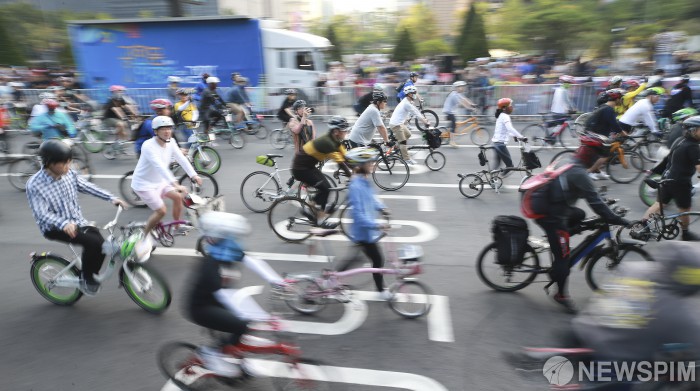 [서울=뉴스핌] 이형석 기자 = 29일 오전 서울 종로구 광화문광장에서 열린 서울 걷·자 페스티벌에서 자전거를 탄 시민들이 반포한강시민공원으로 향하고 있다. 2019.09.29 leehs@newspim.com