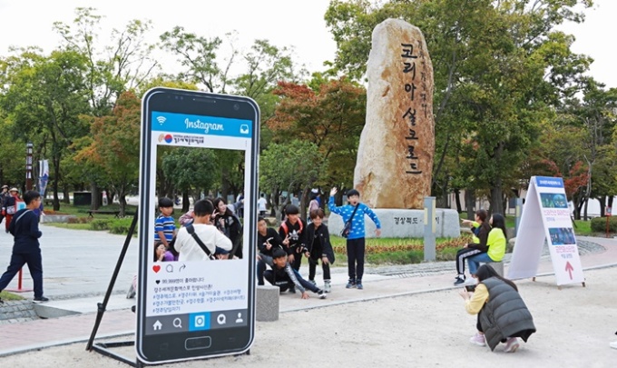 | 2019 경주세계문화엑스포 관람을 위해 방문한 학생들이 다양한 자세로 사진을 촬영하며 인증샷을 남기고 있다.(사진=경주세계문화엑스포) |