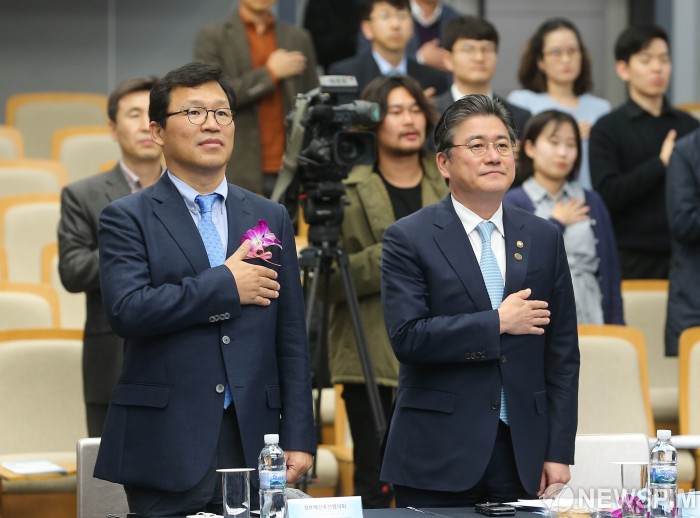 [서울=뉴스핌] 윤창빈 기자 = 정승일 산업통상자원부 차관(오른쪽부터), 윤태범 정부혁신추진협의회 중앙위원장과 참석자들이 8일 오후 서울 영등포구 한국전력공사 남서울본부에서 열린 제6회 혁신성장 이어달리기에서 국민의례를 하고 있다. 2019.11.08 pangbin@newspim.com