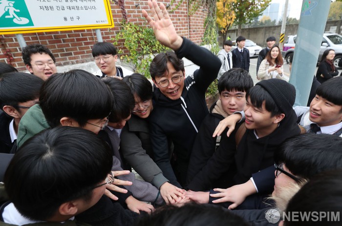 [서울=뉴스핌] 정일구 기자 = 2020학년도 대학수학능력시험을 하루 앞둔 13일 오전 서울 용산구 용산고등학교에서 열린 수능 출정식에서 고3 수험생들이 지도교사와 하이파이브를 하고 있다. 2019.11.13 mironj19@newspim.com