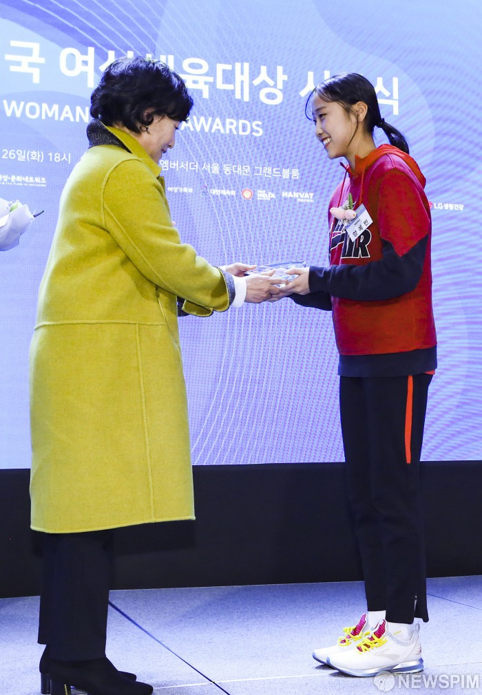 [서울=뉴스핌] 이한결 기자 = 육상선수 양예빈이 26일 오후 서울 중구 노보텔 앰배서더 서울 동대문에서 열린 ‘2019 대한민국 여성체육대상 시상식’에서 신인상을 수상하고 있다. 2019.11.26 alwaysame@newspim.com