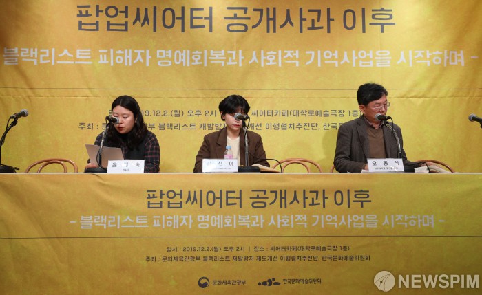 [서울=뉴스핌] 백인혁 기자 = 윤혜숙 연출가(왼쪽 첫번째)가 2일 오후 서울 종로구 아르코극장 씨어터카페에서 '팝업씨어터 공개사과 이후 블랙리스트 피해자 명예회복과 사회적 기억사업을 시작하며' 주제로 열린 블랙리스트 후속 조치 관련 공청회에서 발제를 하고 있다. 2019.12.02 dlsgur9757@newspim.com