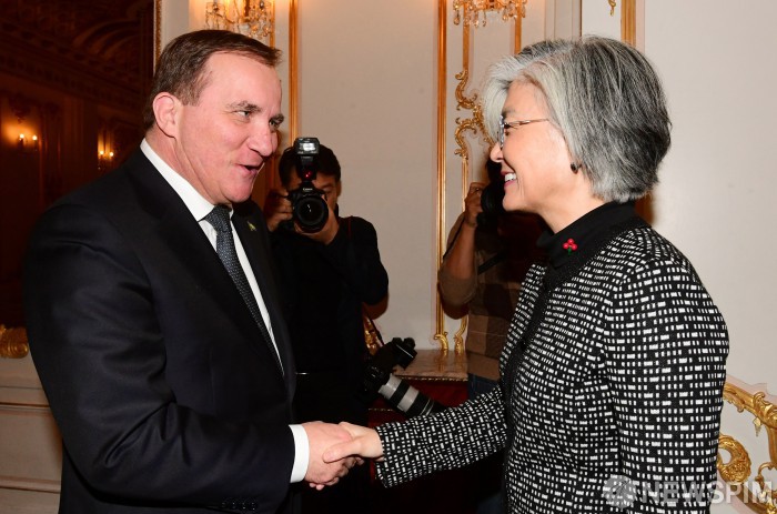 [서울=뉴스핌] 사진공동취재단=강경화 외교부 장관(오른쪽)과 스테판 뢰벤 스웨덴 총리가 20일 서울 중구 롯데호텔에서 면담에 앞서 악수를 하고 있다. 2019.12.20.photo@newspim.com