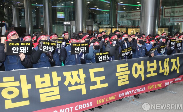 [서울=뉴스핌] 백인혁 기자 = IBK기업은행 노조가 6일 오전 서울 중구 IBK기업은행본점에서 윤종원 신임 기업은행장 출근 저지 집회를 하고 있다. 이날 윤종원 신임 IBK 기업은행장은 출근하지 않았다. 2020.01.06 dlsgur9757@newspim.com